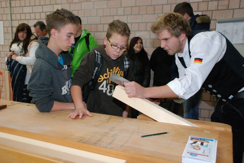 Sören Schierbaum aus Niedersachsen, von 2010 bis 2011 in der Zimmerer-Nationalmannschaft aktiv und Vize-Europameister 2010 in der Mannschaftswertung, zeigte Schülern und Schülerinnen das präzise Sägen. Zudem beantwortete er Fragen, was den Zimmerer-Beruf ausmacht und warum er sich mal für diesen Beruf entschieden hat. Zahlreiche Schüler folgten seiner Einladung und griffen zur japanischen Handsäge, die auch im Wettbewerb benutzt werden und präzises Sägen per Hand ermöglichen. Das fand großen Anklang. Außerdem wurden zahlreiche Fragen zur Kluft gestellt.